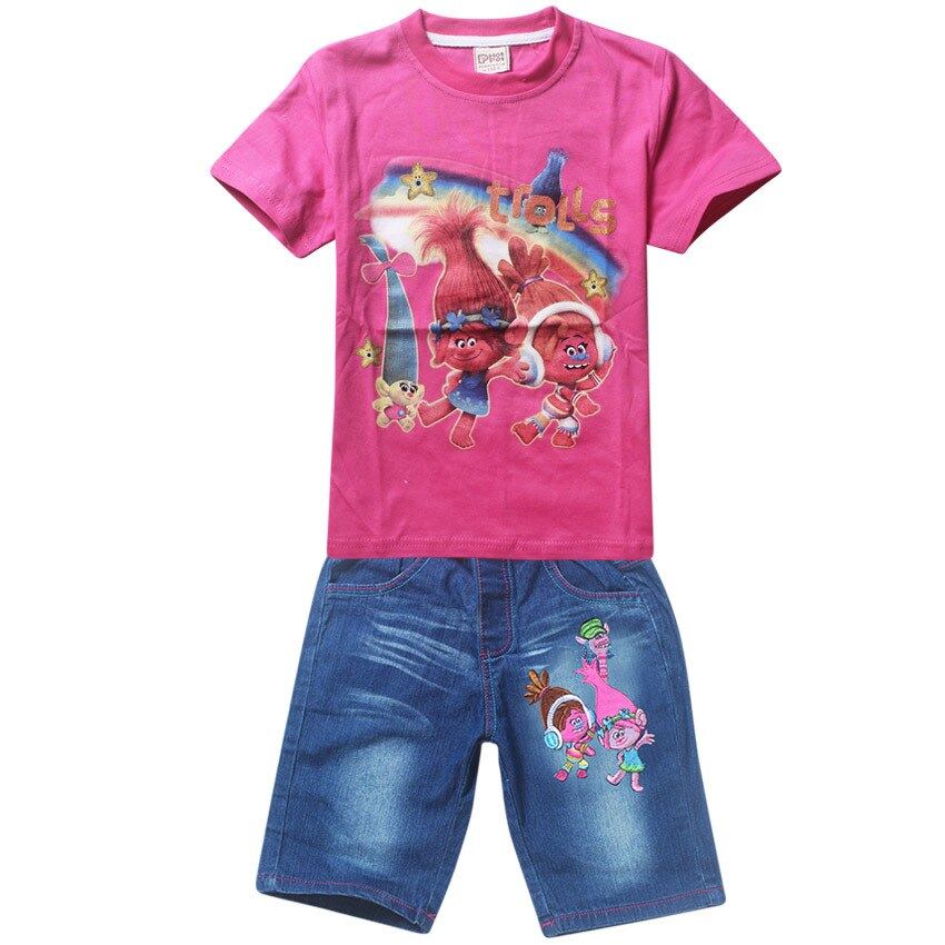 2017夏トロール映画衣装用の女の子服セット子供ツーピースのスーツtシャツ+ジーンズショーツ女の子スポーツウェア