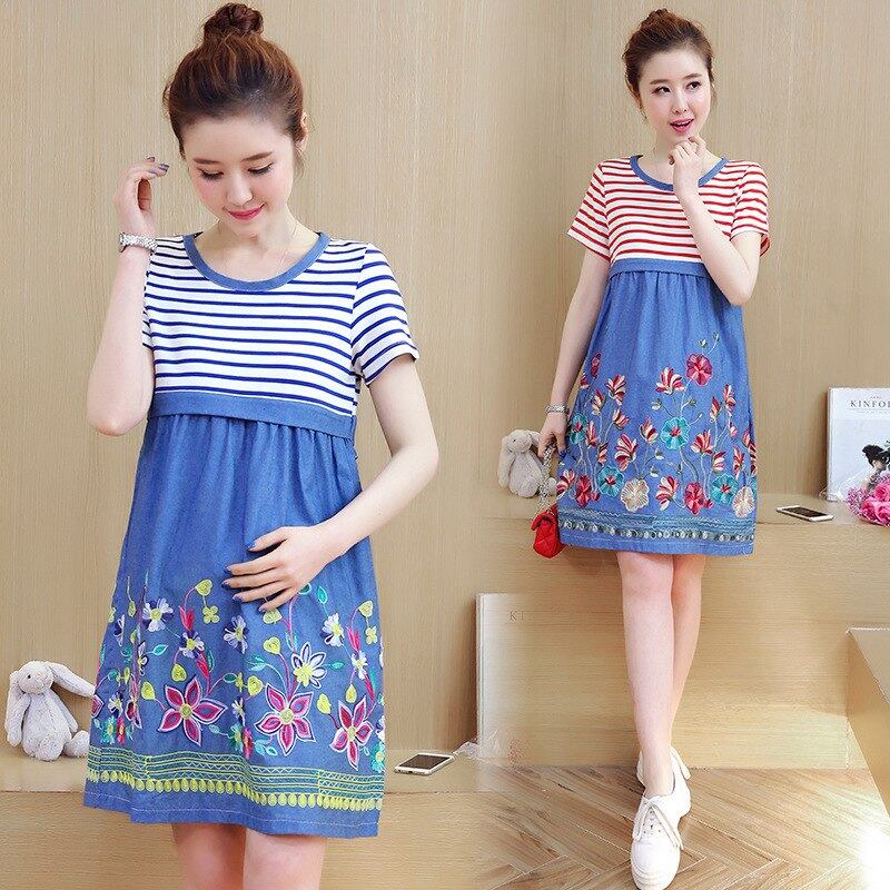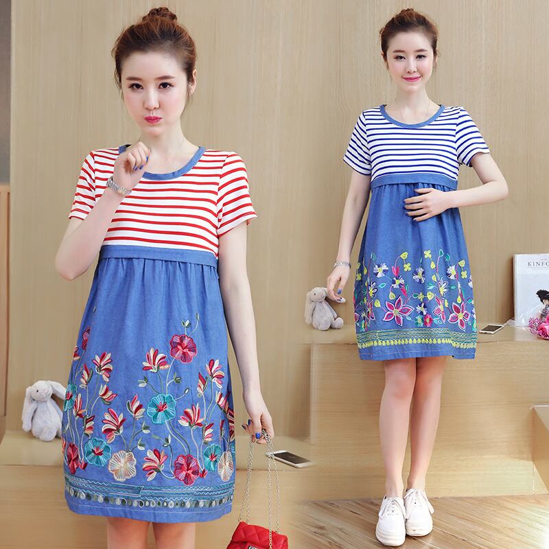 ファッション産科ジーンズドレスで看護服授乳ドレス用女性赤と青のストライプと刺繍デザイン