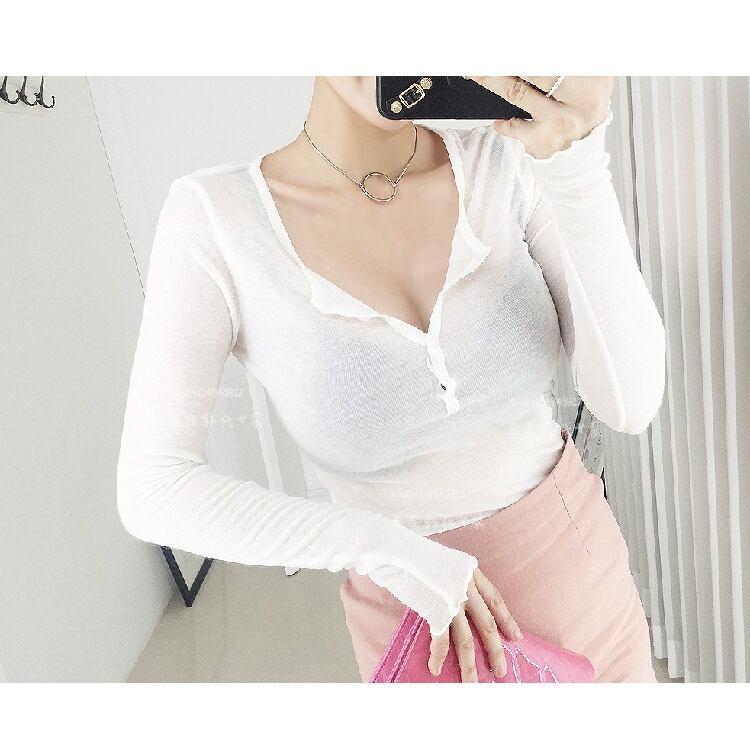 Tシャツの女性2018春夏秋女性トップス薄いセクシーなtシャツvネック長袖camiseta feminina vetementファム