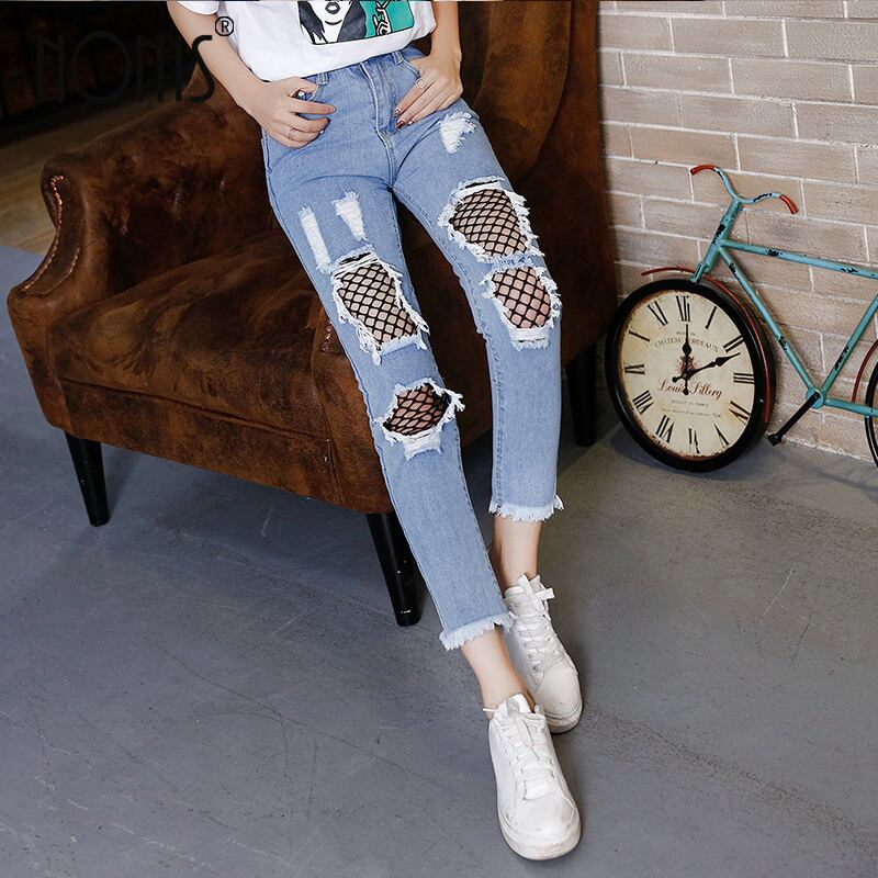 Nonis 2017夏破れたジーンズ女性中空アウト穴メッシュボーイフレンドjeansstreetセクシー徳敏パンツストレート長ズボン