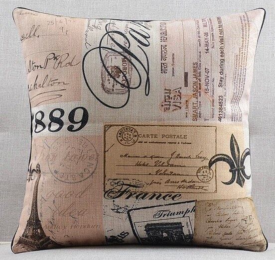 ヨーロッパのヴィンテージレトロなスタイルクッションカバー英語手紙エッフェル塔スタンプシェル枕カバーリネンコットン枕ケース