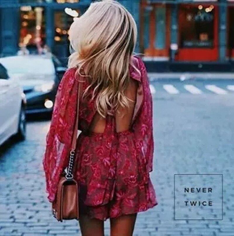 高品質の女性新しいファッションエレガントvestidosボディコンスリムセクシーな滑走路春夏シフォンプリント背中の開いたショートジャンプスーツ