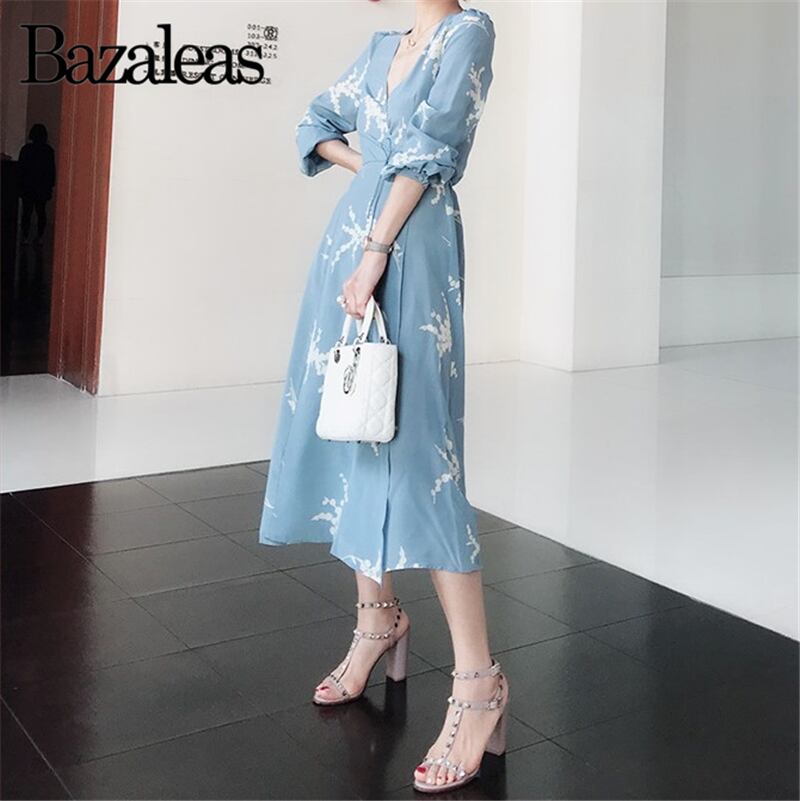 Bazaleas女性ブルーフローラドレス分割vestidosディープvネックロングスリーブドレス