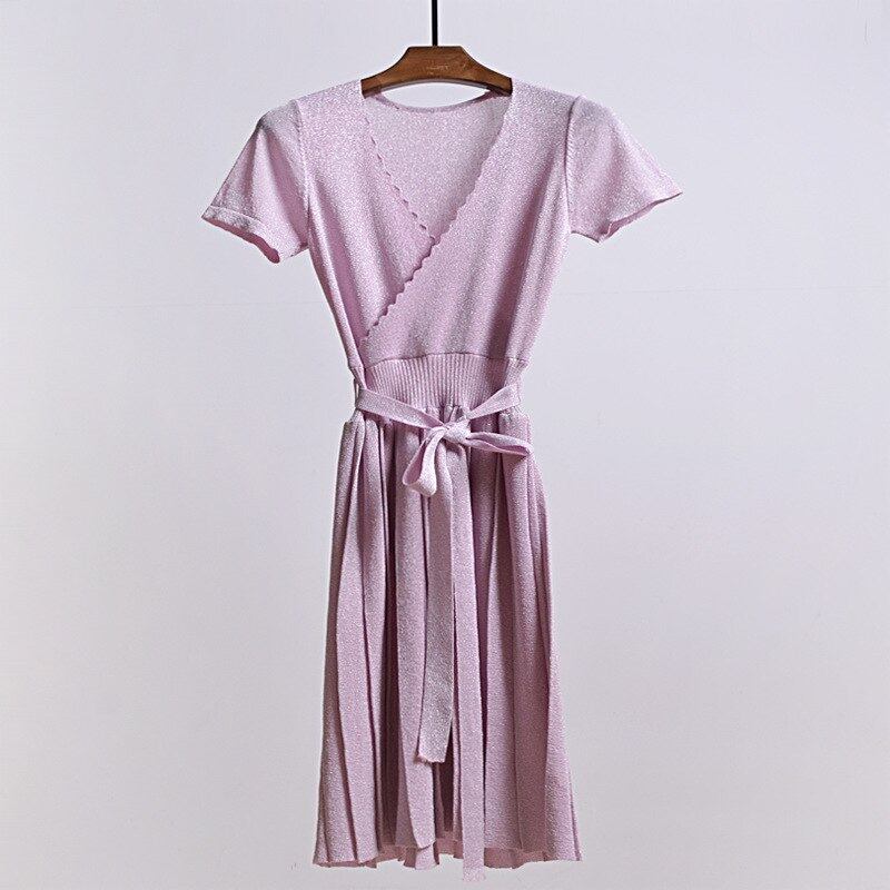 女性光沢のあるニットジャンパードレス夏セクシーな深いvネックスリム半袖女の子のドレス女性プリーツドレスでベルト
