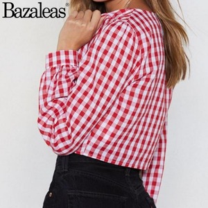 2018 赤白のチェック柄女性ブラウスボタンブランドファッション丈ブラウス
