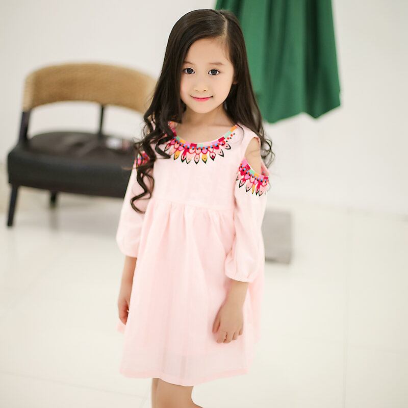 2017夏の女の子プリンセスドレスショルダー穴カットプリント子供服ファッションストラップレス刺繍印刷ドレス女の子服