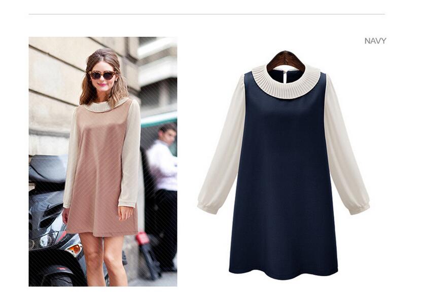 2016新しい秋プラスサイズの女性の長袖ドレスラウンドネックパッチワーク緩い底ドレスカジュアルvestido xl-5xl FD289