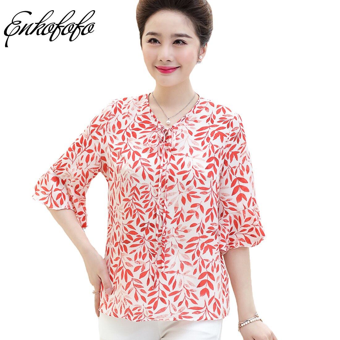 L-4XL 純粋な絹のブラウスレディーストップスとブラウス服フレア半袖シフォン葉プリントネクタイ弓ファム Blusas Femininas