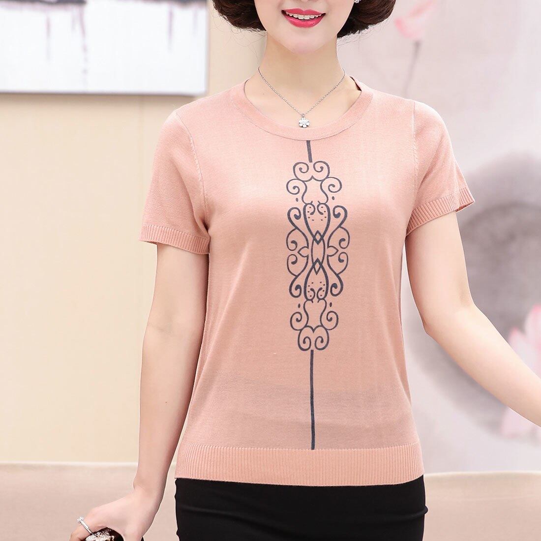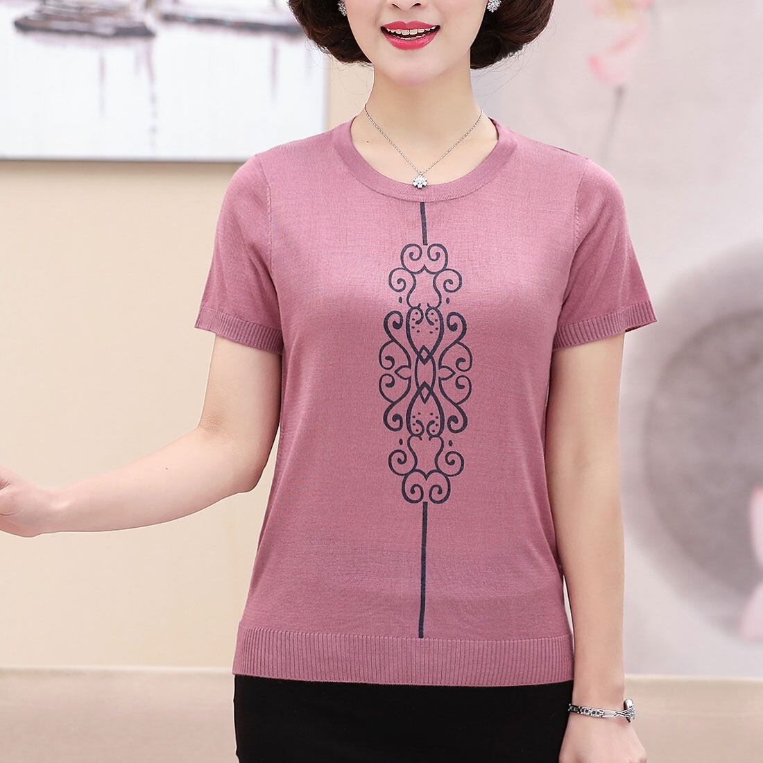 M-4XL シルクコットン Tシャツ女性の夏プリント半袖ニット Tシャツ中年母 Tシャツレディースカジュアルトップス