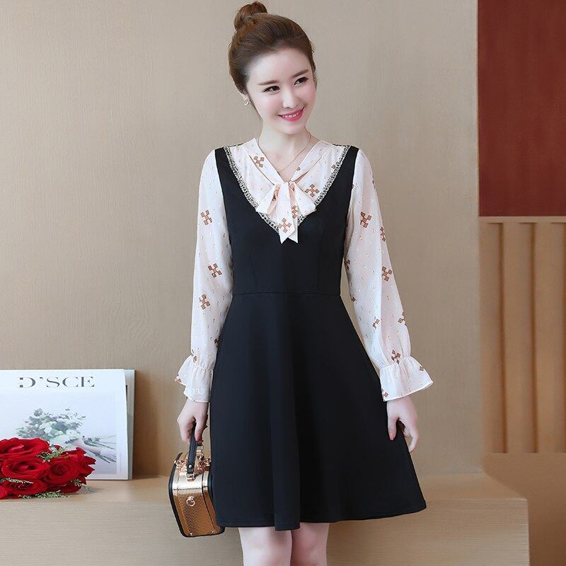 女性の服 2018 新しい秋のファッションシフォンパッチワークフレア長袖ドレス弓 V ネックプラスサイズのドレス女性