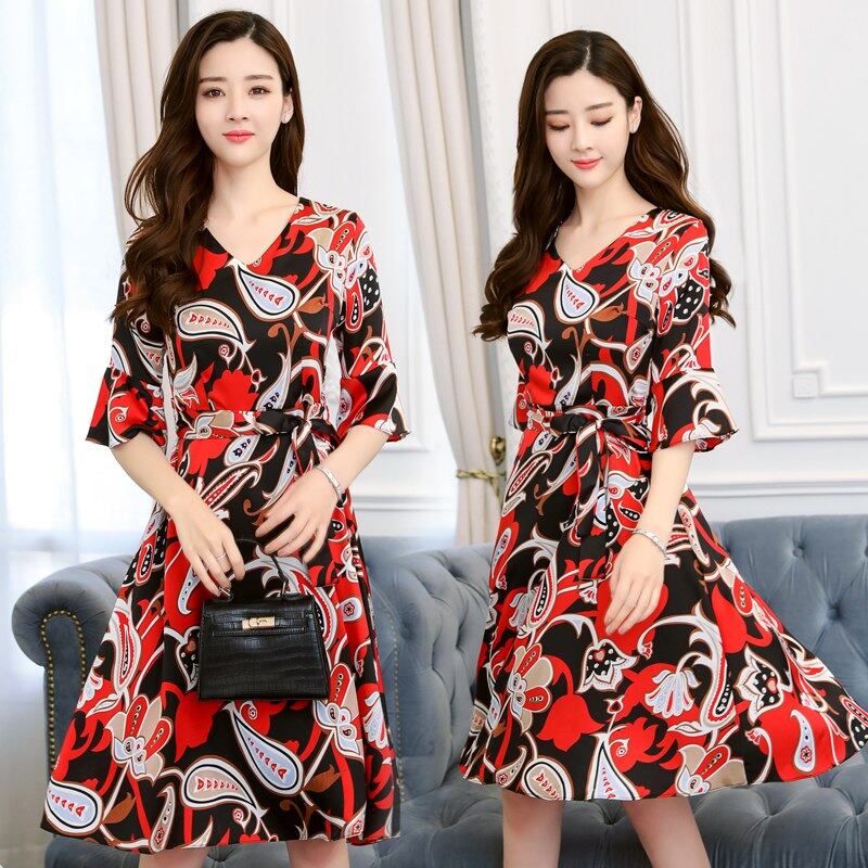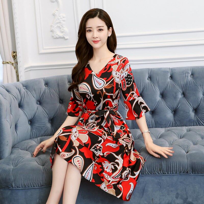 女性の衣服 2018 新夏の花印刷ヴィンテージファッション V ネックドレスフレア七分袖サッシシフォンドレス