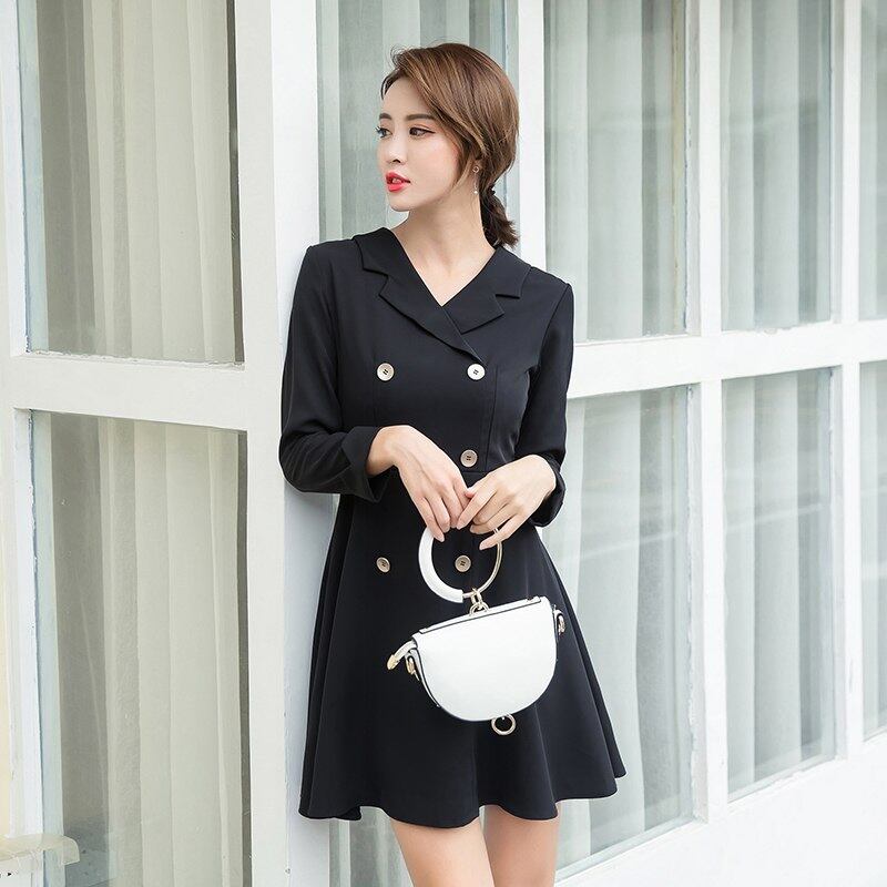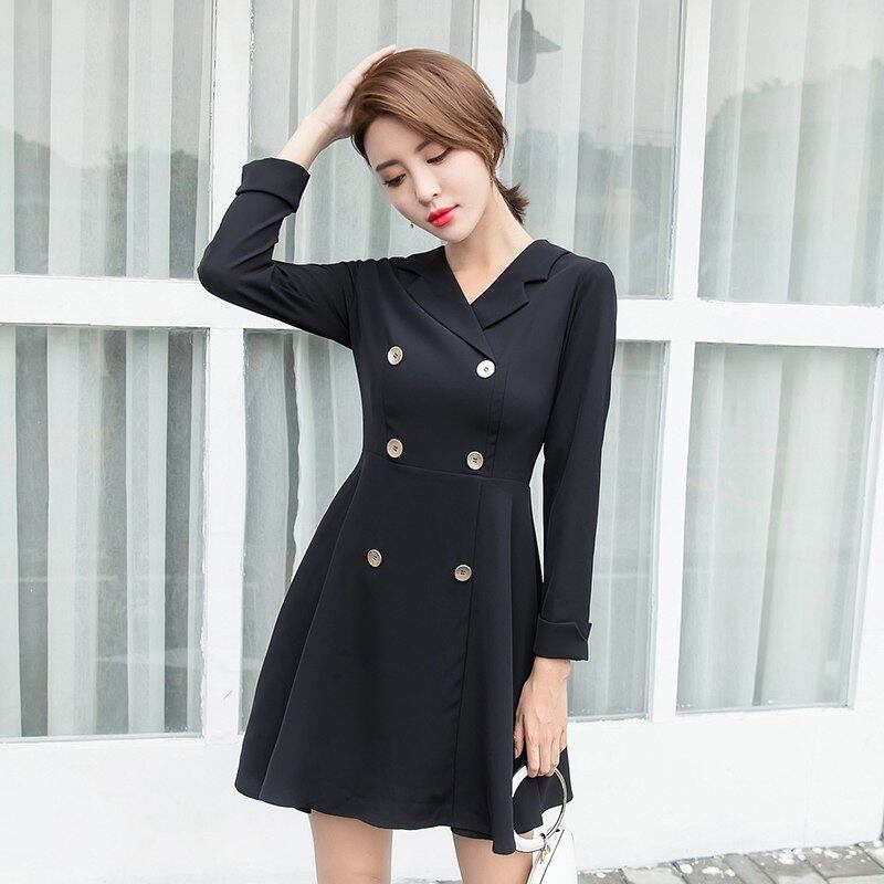 女性の服 2018 新しい秋のファッション V ネック長袖ドレスボタン無地簡単なヴィンテージドレス女性