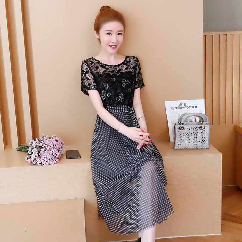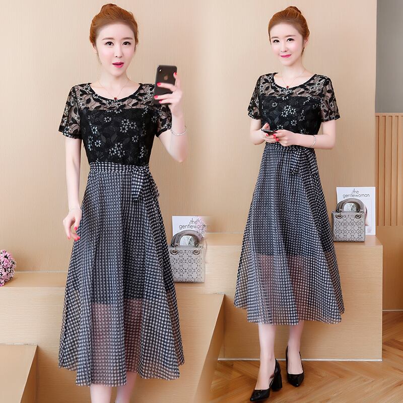 女性の服 2018 新夏のファッション O ネック弓半袖ドレスパッチワークチェック柄レースメッシュドレス女性