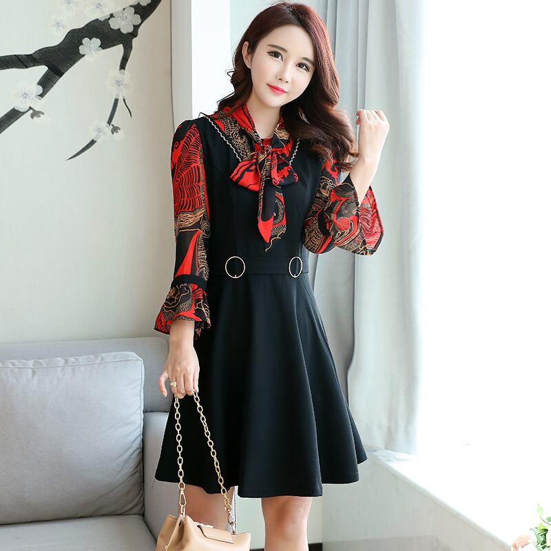 2018新しい女性の服夏のファッション弓vネックプリントパッチワークドレスフレア三四半期スリーブプラスサイズドレス女性