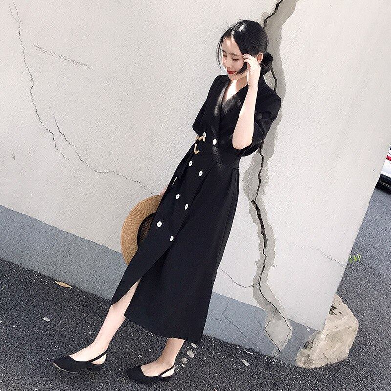 女性の服 2018 新夏のファッション V ネック無地ドレスボタン半袖ロング女性