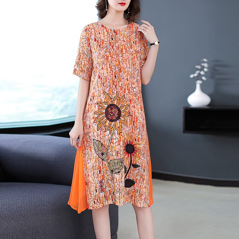 女性の服 2018 新夏のファッション O ネック五分袖ドレス花プリントルーズ女性