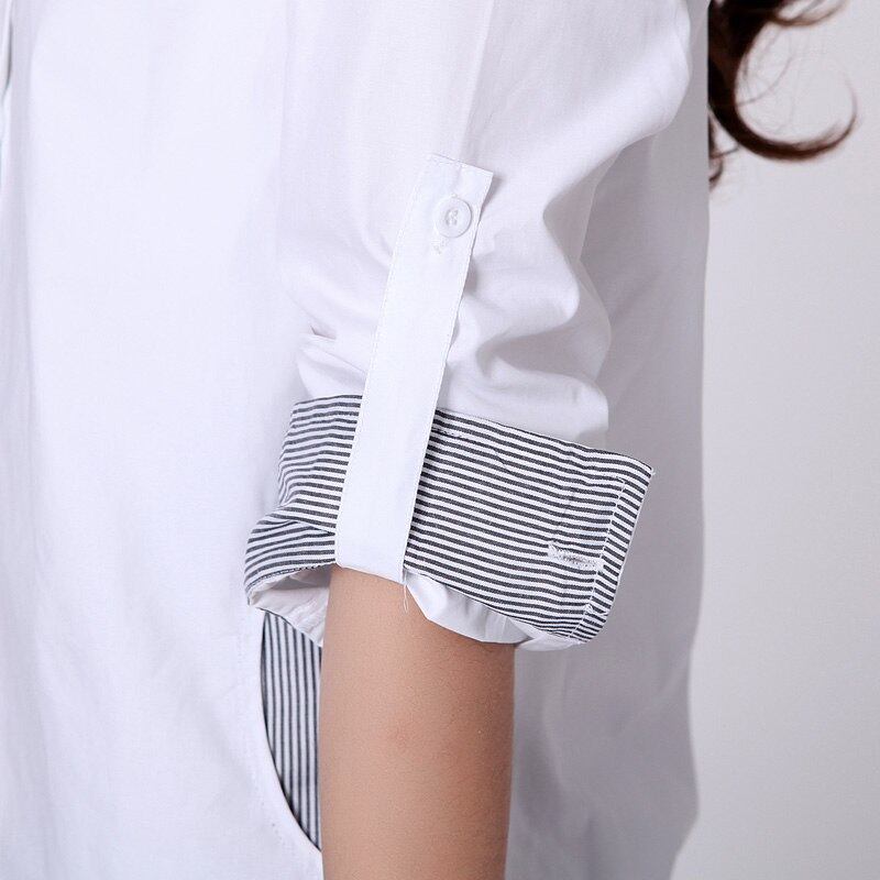 キャリアレディファッションホワイトコットンシャツサイズs-2xl縞模様のパッチワークデザイン服女性cotttonロングブラウス