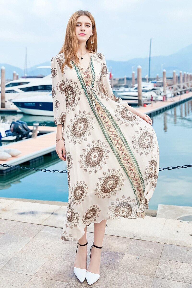 女性の服新しい夏のファッション三分袖シフォンドレスvネック花印刷ボヘミアンロングドレス女性