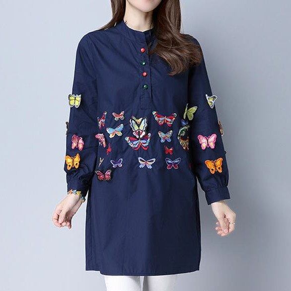 三次元の蝶新しい 2017 刺繍春長袖綿 100% ルーズ国家風ブラウス