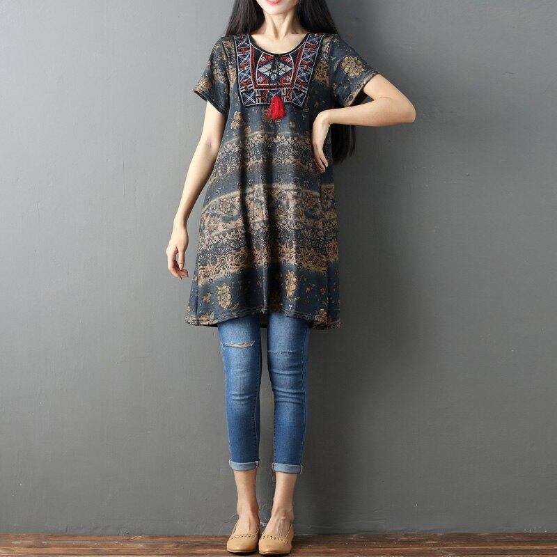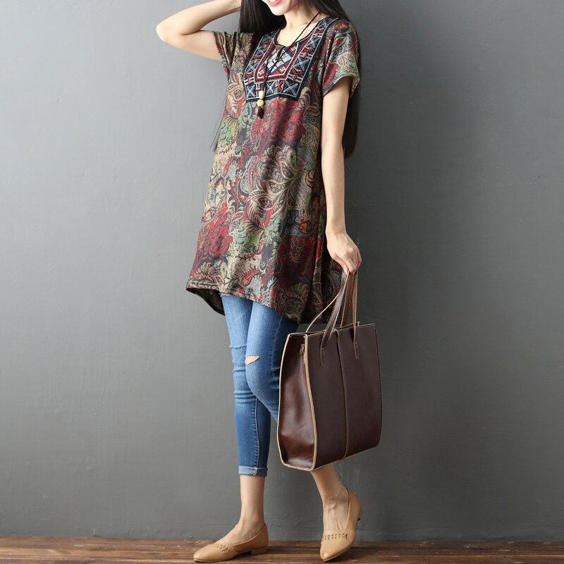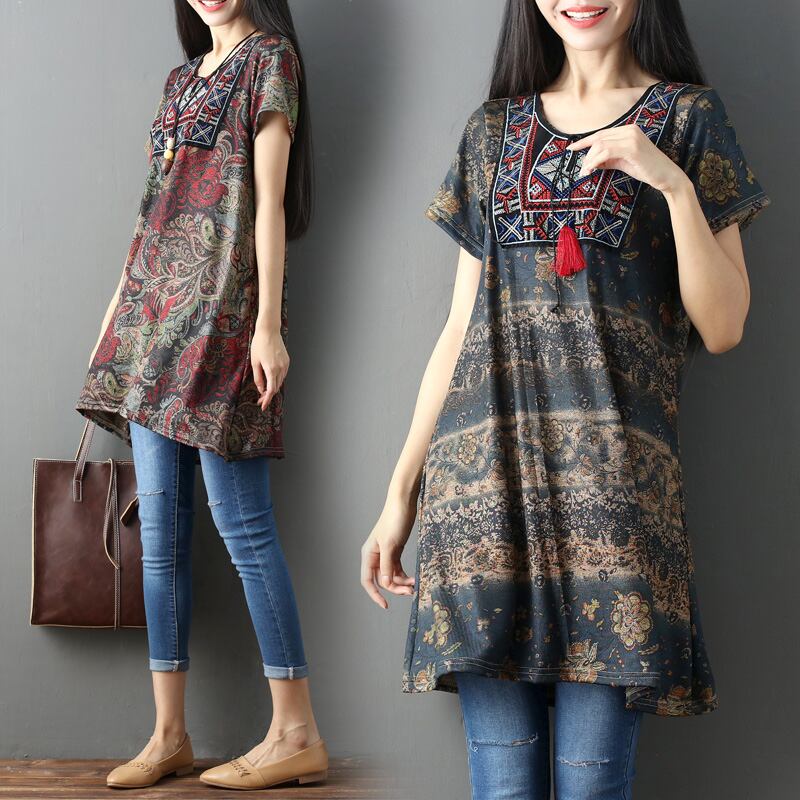 2017夏新プラスサイズ緩い女性のtシャツを印刷ヴィンテージ半袖トップスエスニックスタイルロングtシャツ