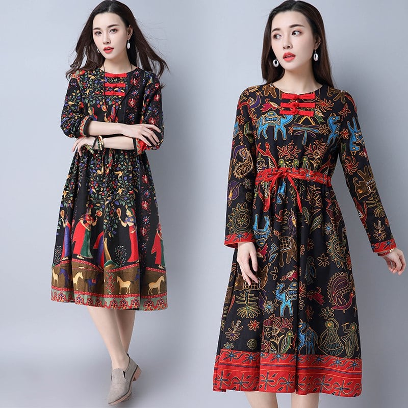 2017春の女性の春ヴィンテージ中国スタイルのコットンロングスリーブドレスプリント巾着ドレス
