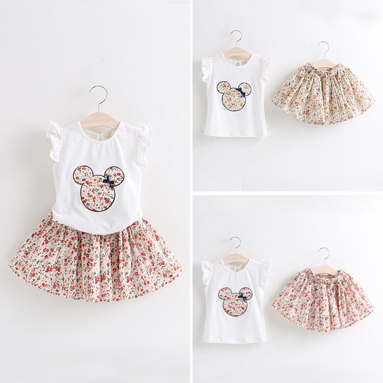 子供服夏子供女の子セット花飛んスリーブt-シャツ+スカート二枚スーツファッションの女の子セット衣装