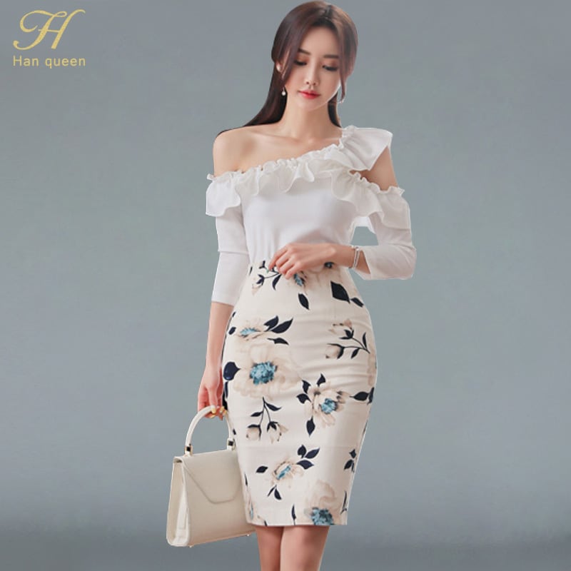 Hハン女王フリル2ピースセットレディースファッションクロップトップスとスカートセットスリムビジネス仕事シースカジュアルペンシルスカートスーツ
