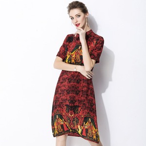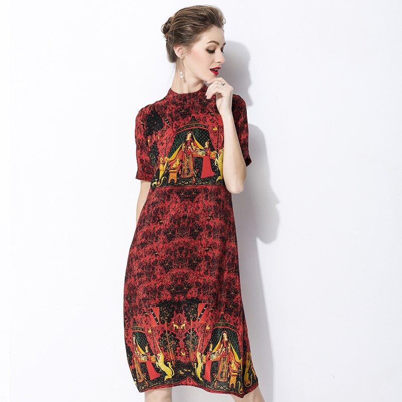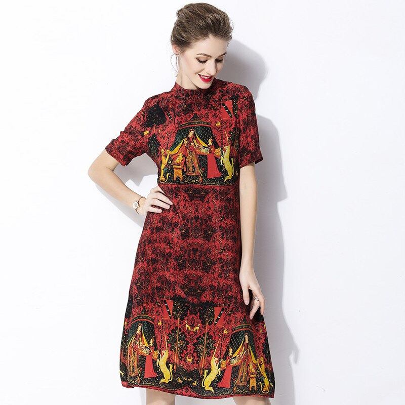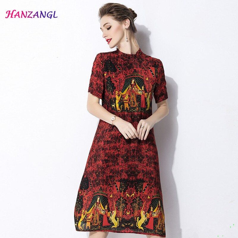 HANZANGL 新 2018 夏の女性のスタンドカラー半袖ヴィンテージプリント作業オフィスカジュアルシフォンドレス