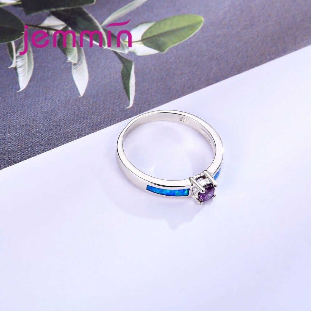 Jemmin ブルーオパールリング結婚指輪のためにラウンドクリスタル婚約指輪人間サンドバッグ 925 スタンプスターリングシルバーパーティージュエリー