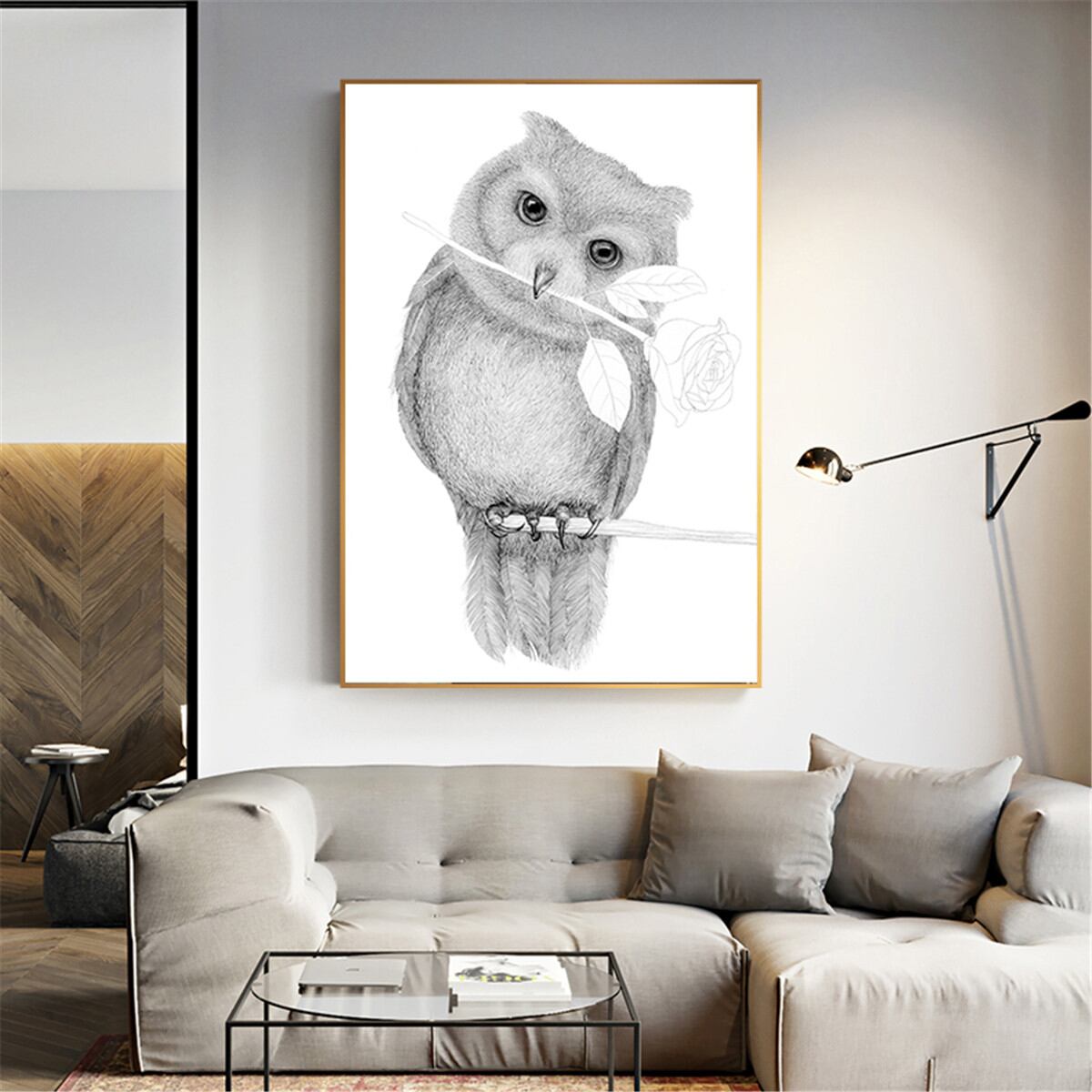 現代のキャンバス絵画写真スケッチのフクロウローズポスターと版画家の装飾ポスター黒と白の壁アート