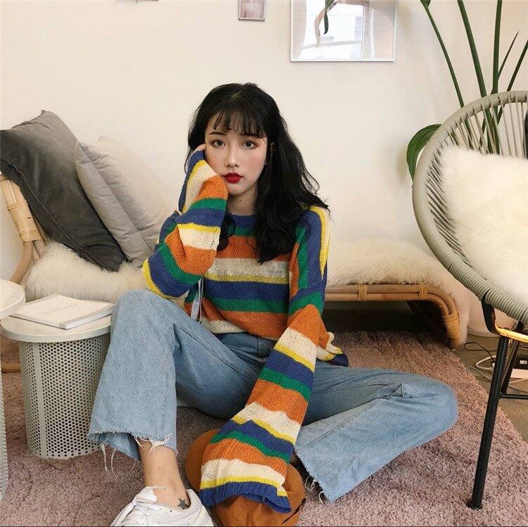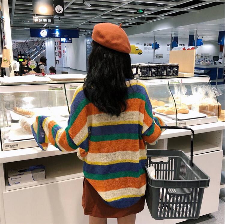 韓国のファッションの秋虹原宿セーター女性長袖特大ストライプセータープルオーバーニットジャンパールーズトップス冬
