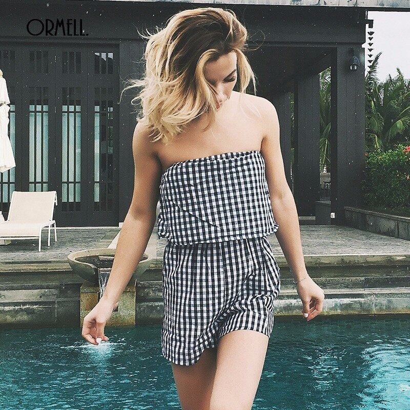 Ormell夏レディースストラップレスタータンチェックジャンプスーツ女性新しいホット綿ヴィンテージオフショルダーセクシーな短いroupas femininaビーチ衣装