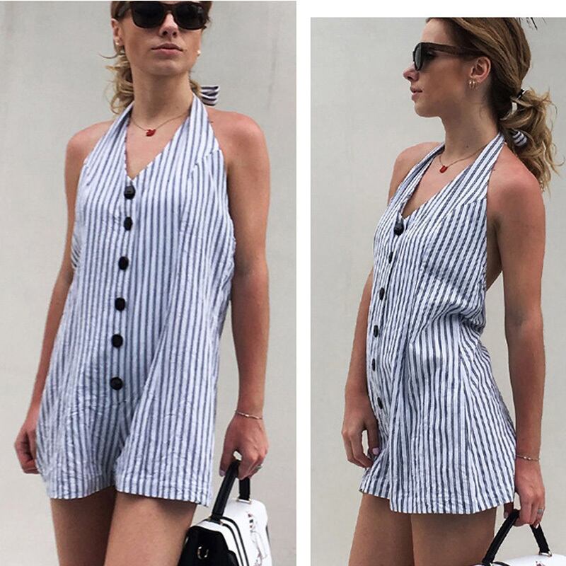 Ormell夏レディースセクシーなストライプショートジャンプスーツ女性2018ヴィンテージノースリーブオフショルダーvネックビーチボディスーツ女性ファム