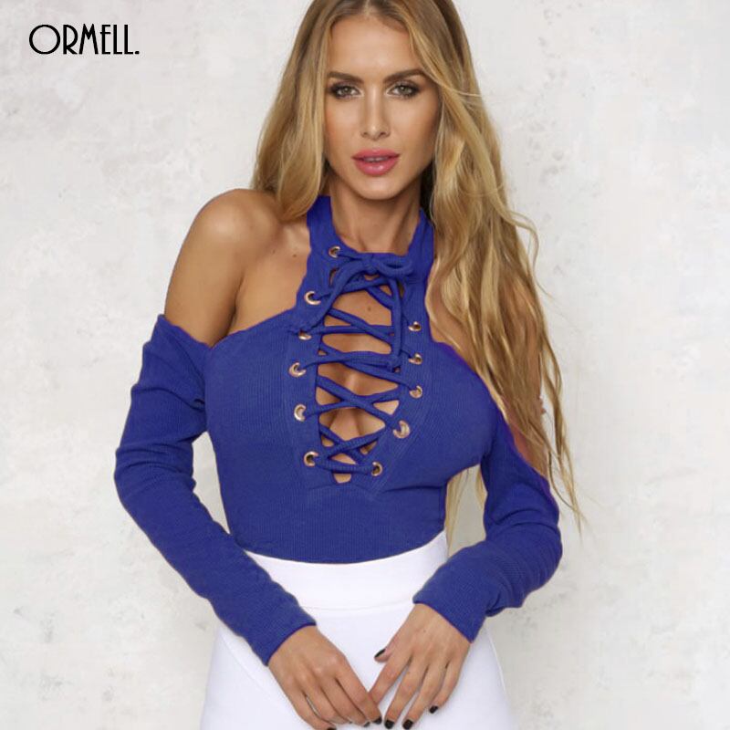 Ormell女性レースアップニットボディスーツセクシーなホルターオフショルダーロングスリーブジャンプスーツロンパース秋冬パーティークラブセーター