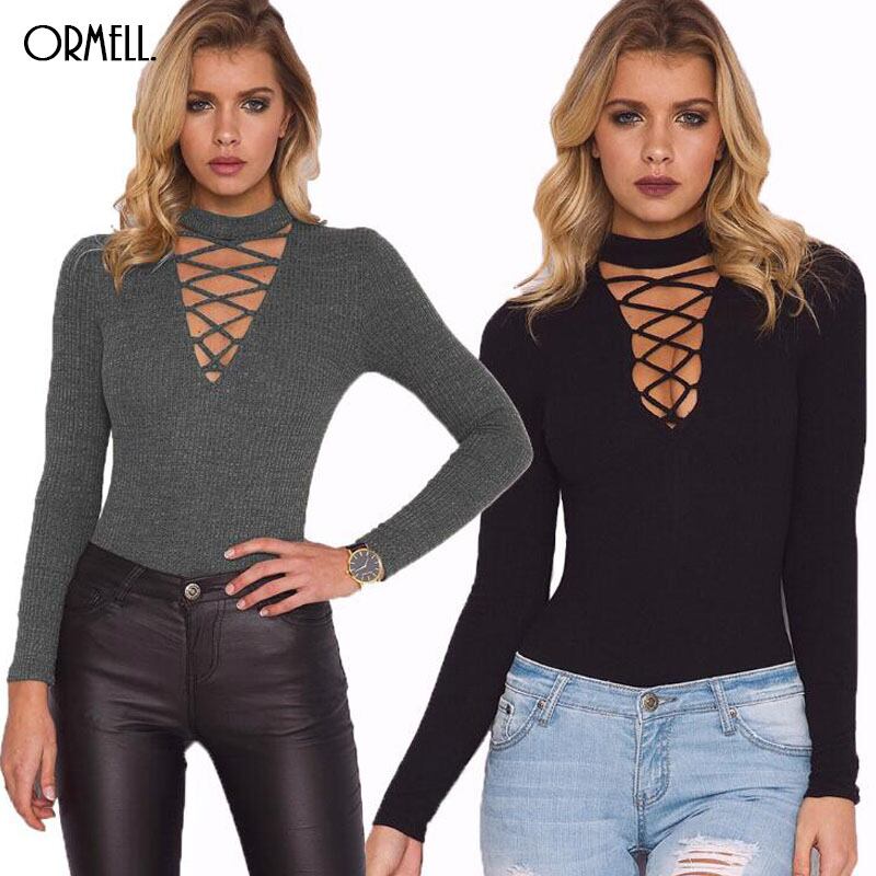 Ormell秋冬セクシーなホルターニットトップス女性ジャンプスーツロンパースレースアップスリムロングスリーブロンパース&弾性クロスボディコン