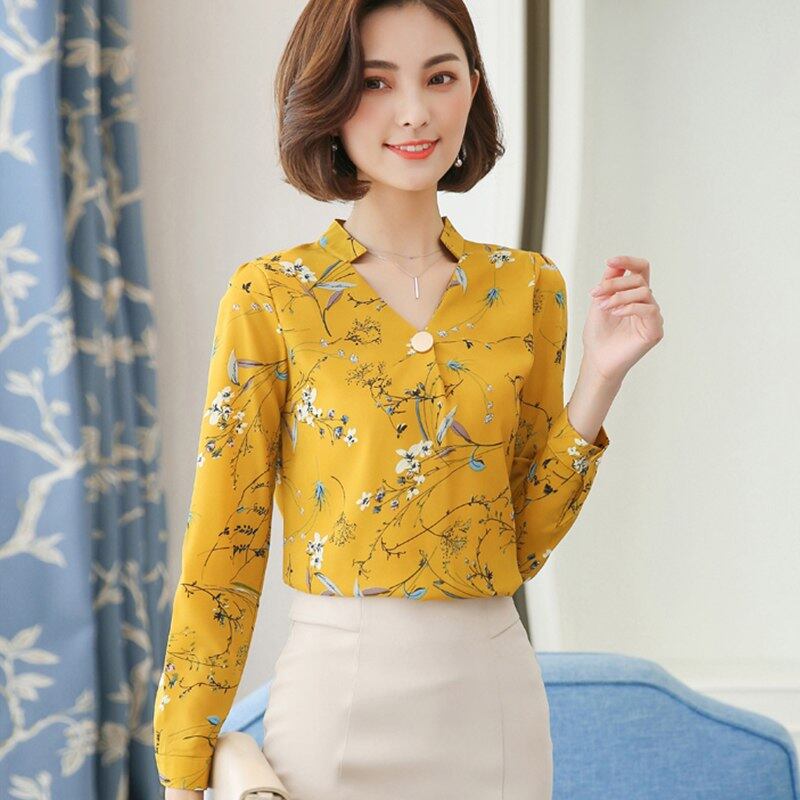 レディーストップス秋 2018 ビッグサイズの花柄プリントシャツカジュアルイエローシフォン韓国ブラウス長袖女性フルスリーブのトップス