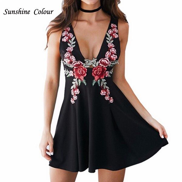 刺繍アップリケエレガントなドレスセクシーなvネック背中の開いた女性カジュアルウクライナaラインドレスvestidoデ・フェスタ